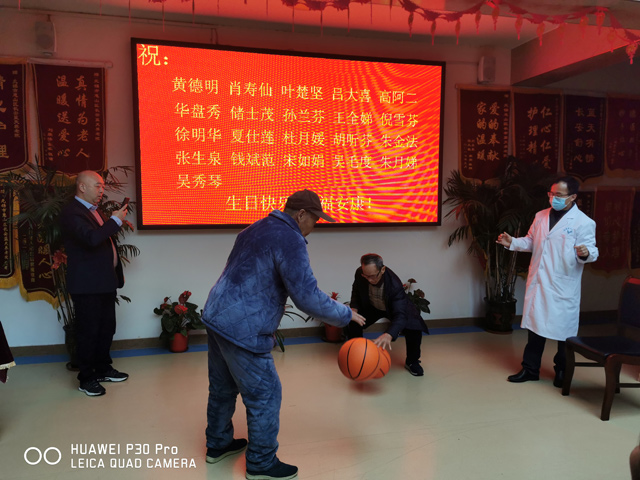 生日会后给大家安排了一场拍篮球的比赛活动。长者们边吃着蛋糕,边观看比赛活动,活动规则是在一分钟内,记录连续拍篮球的数量,以拍的数量来决出名次。共评出一到六等奖,其他为参与奖。张哲们个个兴致极高,踊跃参加,有的长者不能站就坐着拍,有的一只手不能动就单手拍。